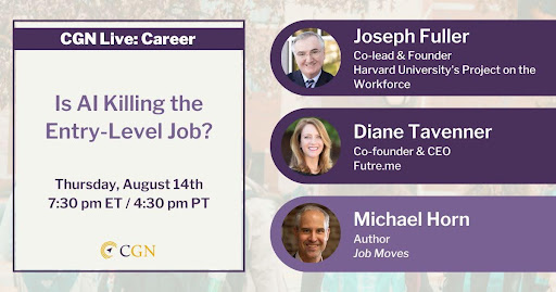 Michael Horn, Author of Job Moves, hosts this College Guidance Network webinar with Joseph Fuller, Co-lead & Founder of Harvard University's Project on the Workforce, and Diane Tavenner, Co-founder & CEO of Futre.me. This webinar is on Thursday, August 14th at 7:30pm ET/4:30pm PT.